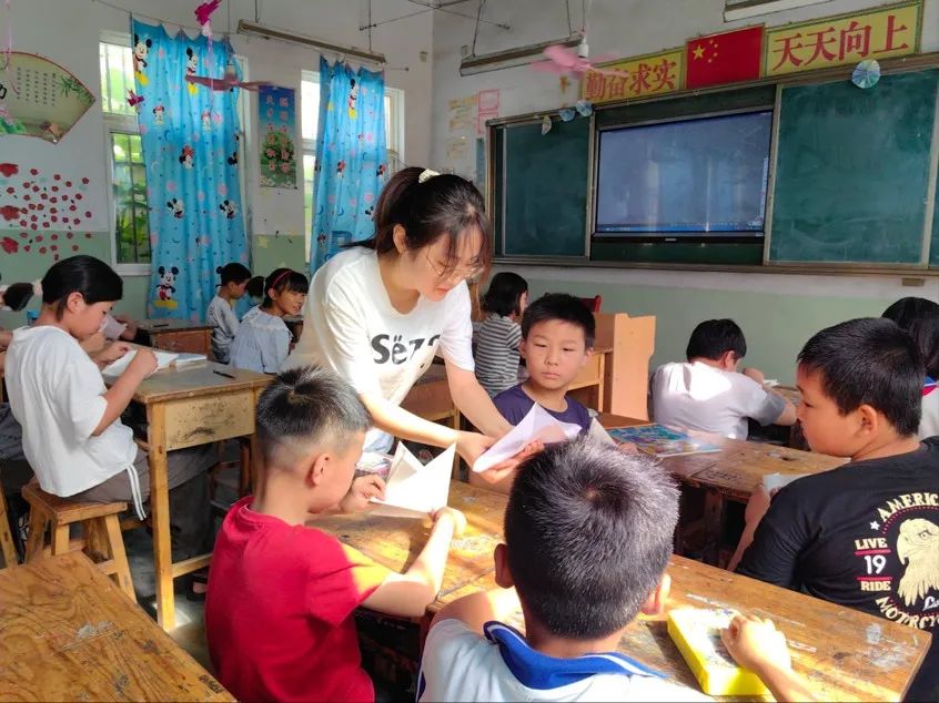 上午,实践团成员给小朋友们带去一节欢乐创意手工课。课堂上为小朋友们分发了彩纸,让小朋友们跟随实践团成员赵文宜学习千纸鹤的折法,其他实践团成员负责为小朋友们解答疑惑。除此之外,实践团成员李阳为同学们讲解了科学实验,用一根简单的橡皮筋讲述了“声音与频率之间的关系”,让同学们在玩耍中学习知识。