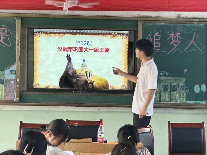 7月11日,让我们一起走进“三下乡”第六天的生活吧。迎着朝阳,伴着微风,早上,实践团成员带领六年级的同学们徜徉在历史的长河中,感悟西汉的鼓角争鸣,领略到隋唐的盛世雄风。另一边四五年级的同学们则进行了丰富有趣的英语课,实践团成员严肃认真,同学们听的津津有味。